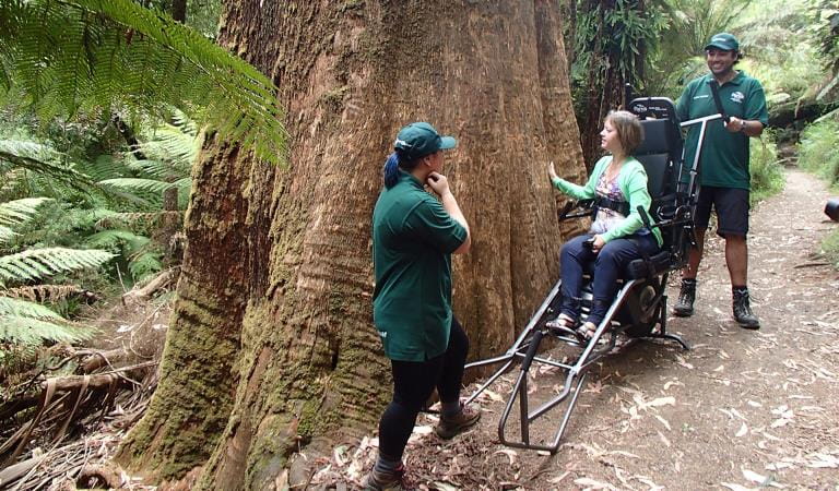 There are two designated disabled parking bays halfway down the parking area. Each bay is 3.8 metres wide with a curb cut onto the footpath. From the disabled parking bays, a 90-metre path with a 1:50 gradient leads to the observation area. The observation area is level with supportive bench seating. There is also an easy to read information board.