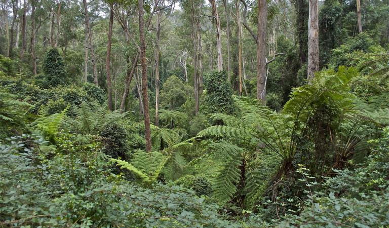 The warm temperate rainforest through which the trail winds is characterised by a closed canopy of Kanooka (Tristania laurina) with various lianas, ferns and epiphytes occurring at all levels through the forest.