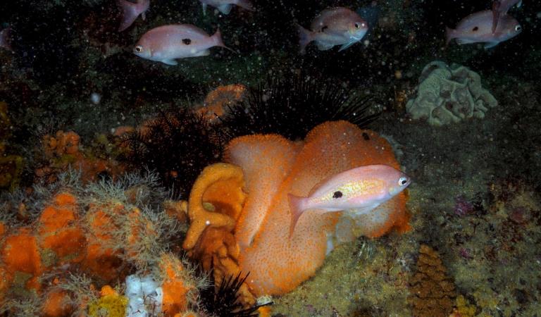 Many other creatures are visible between the sponges, under rocks and poking out of the seaweed holdfasts. There are brightly coloured sea-stars, brittle stars, abalone, fan worms, hermit crabs and delicate nudibranchs (sea-slugs). Fish include schools of Butterfly Perch, Silver Sweep and Long-Finned Pike, with Banded Morwongs common amongst the deeper boulders.