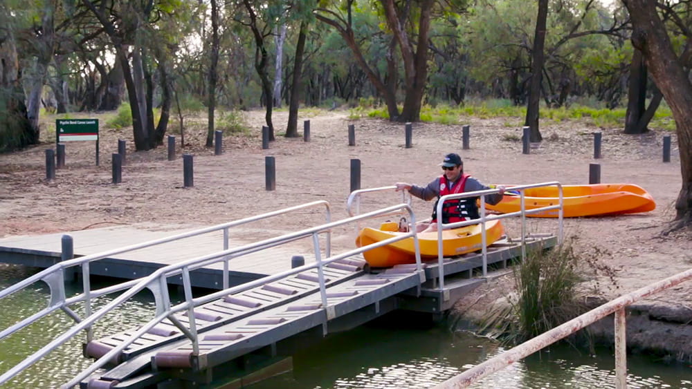 Victoria's first all-accessible floating pontoon and canoe launcher is at Psyche Bend in Kings Billabong in Mildura.