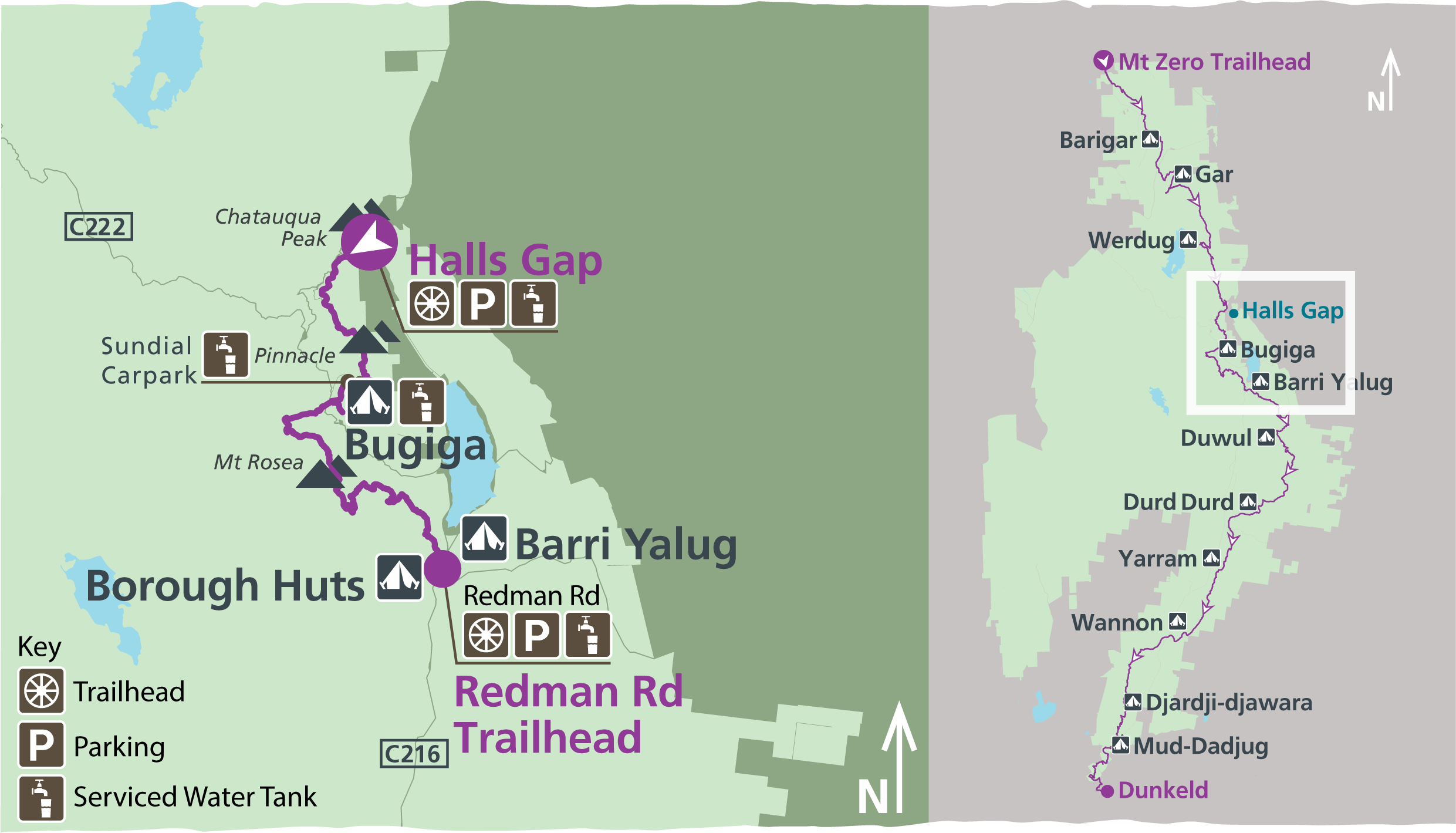 This 3-day hike connects with other day walks and tracks to allow you to step on and off from various points throughout Gariwerd such as returning to Halls Gap, or adding an additional night at Borough Huts Campground. The trailhead for this itinerary is Halls Gap and access to the trail is signposted. Find out more about the central Grampians walks in the official map for Grampians Peaks Trail. You can find out how to get to Halls Gap via the map above. All itineraries require a car shuffle from start to finish. If you only have one vehicle, please visit Brambuk the National Park and Cultural Centre for other pick-up or walk options.