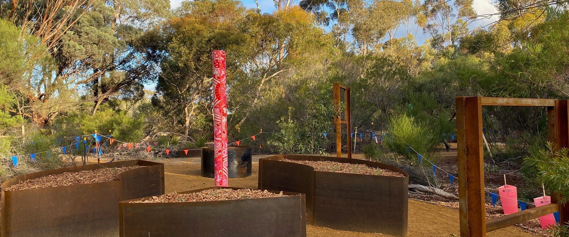 The Sensory Garden features artworks by artist Jenna Oldaker, a Wadawurrung Traditional Owner based in Ballarat on Wadawurrung Country.