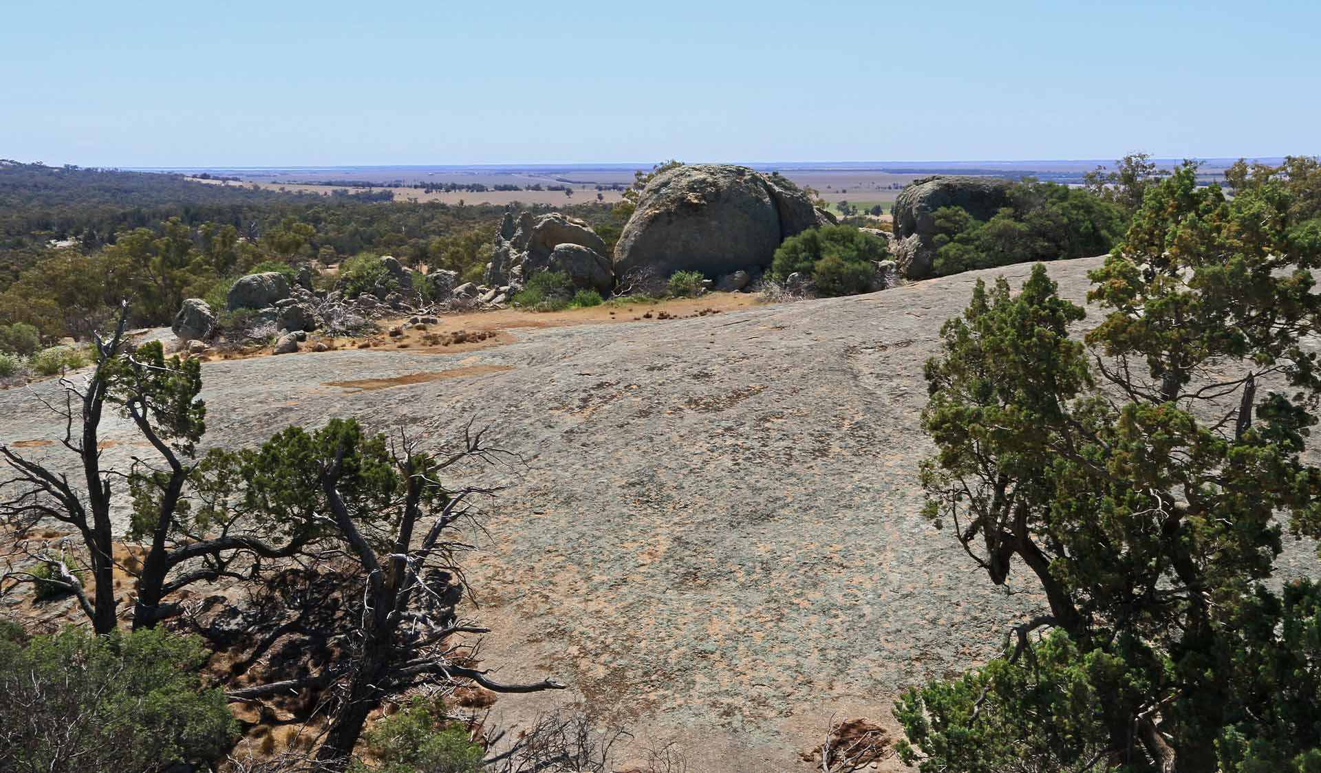 Take the short, steep walk to the summit of Mt Terrick Terrick for spectacular views over the park and surrounding farmland, and watch raptors soaring over the plains. Follow the well-defined Grade 3 track from the picnic area, then choose your own path up the granite rocks. Take care in wet and windy weather as the rocks may be slippery and the summit is exposed. Wear shoes or boots with a good grip.
